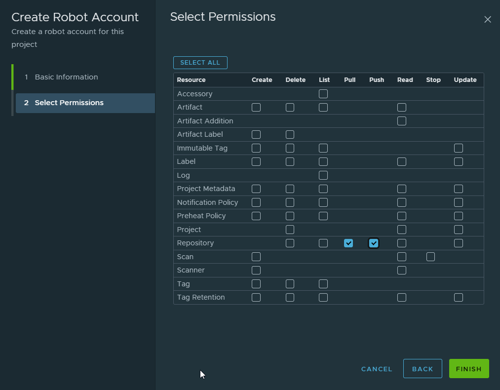 Note: I granted both pull and push permissions to this single robot account. In a production environment, these accounts should be separate. OKD would use a pull-only account for deploying images. This reduces the attack surface, if the deployment credential were ever compromised, an attacker could not push or modify images in the registry.